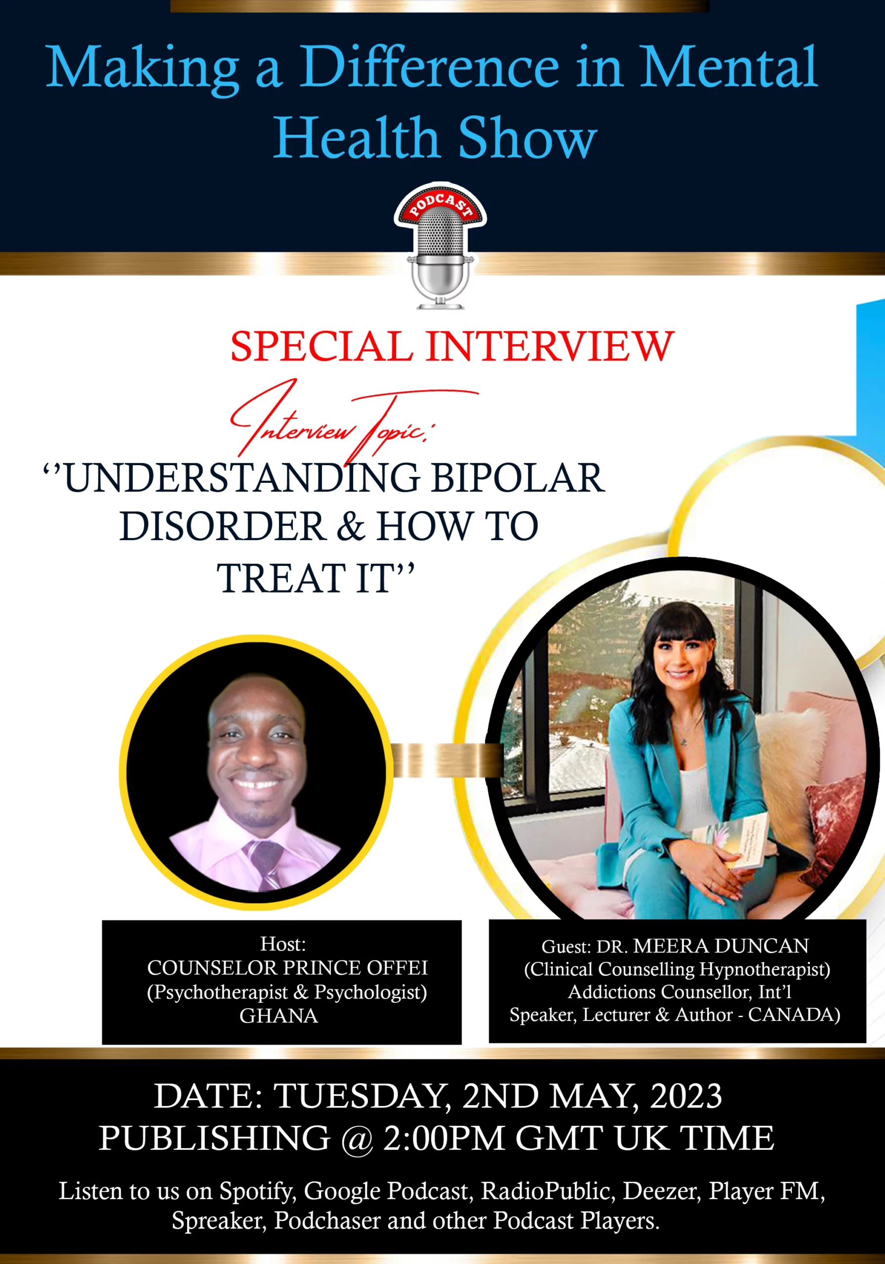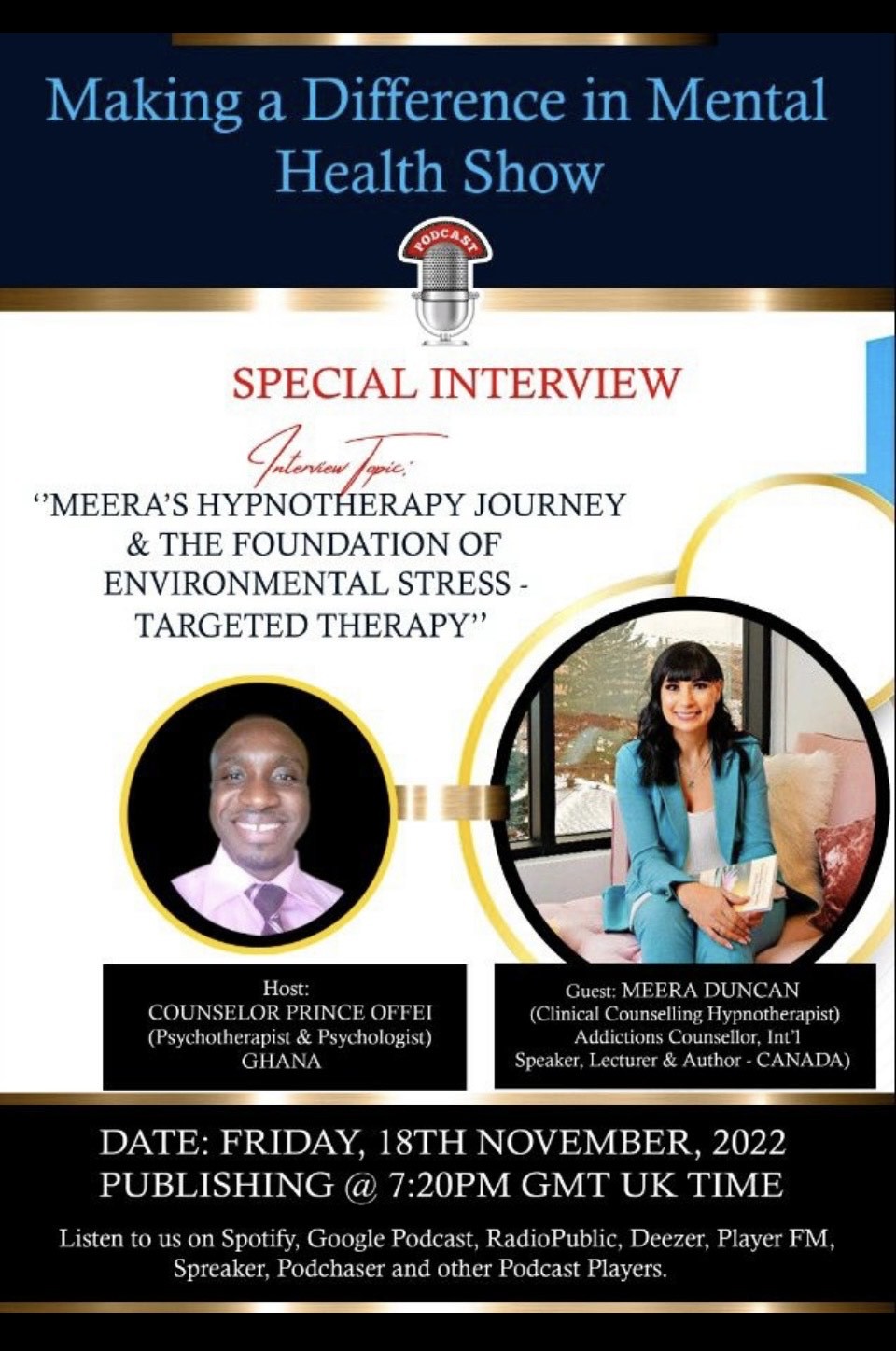 “Join our UPCOMING Twenty-eighth (28) episode featuring Meera Duncan, Author, Counselling Therapist, & Registered Clinical Counselling Hypnotherapist, in a SPECIAL INTERVIEW. Making a Difference in Mental Health Show.
